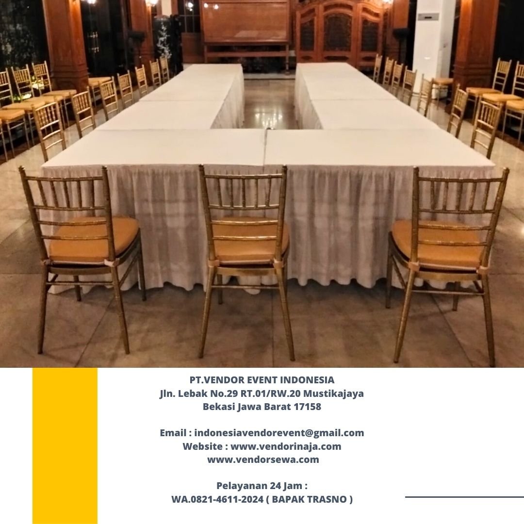 PT.VENDOR EVENT INDONESIA pusat Rental Kursi Tiffany,Meja Kotak,Sofa Studio,Kursi Tiffany Jakarta kualitas terbaik dengan harga anti mahal. Kursi tiffany yang disewakan kursi tiffany kayu warna gold,putih,hitam. Untuk meja kotak tersedia dua pilihan mulai dari meja kotak ukuran 120x60cm,meja kotak ukuran 120x80cm. Meja kotak terbuat dari multiplek,hpl,kerangka besi. Sofa studio yang disewakan tentunya dalam kondisi bagus,bersih,terawat.
